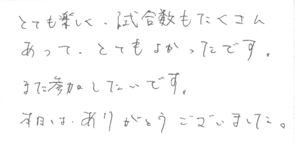 試合はやればやるほど勝てるようになるようですので、ぜひまた経験を積みにご参加くださいませ!