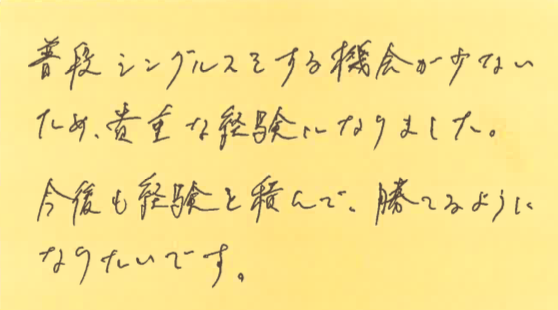 シングルスの機会が少ないとのことで、貴重な経験になられて良かったです!