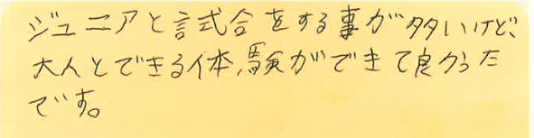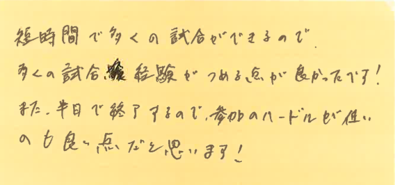 大会が進むにつれ、皆さんどんどん上達していき、やはり試合経験を積むことは本当に大事なことだと再認識いたしました。