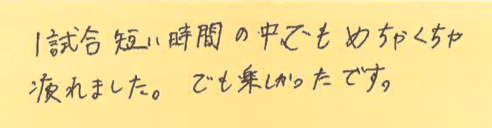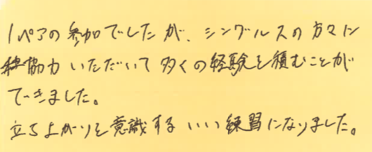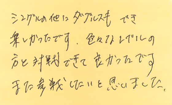なお、この日は、シングルスは12名集まったのですが、ダブルスは1ペアのみのエントリーでしたので、シングルスの皆さんで組ませいていただき、しっかりと5試合お楽しみいただきました!