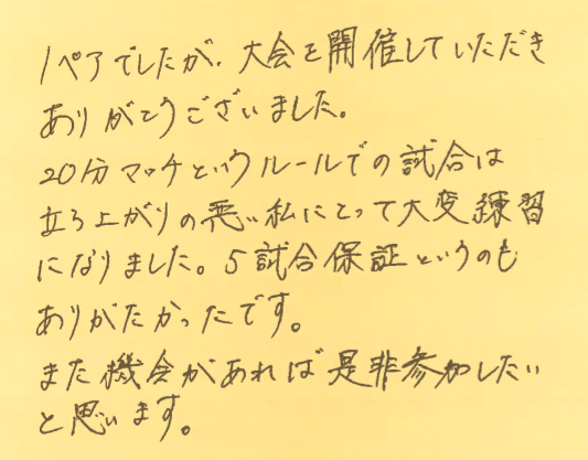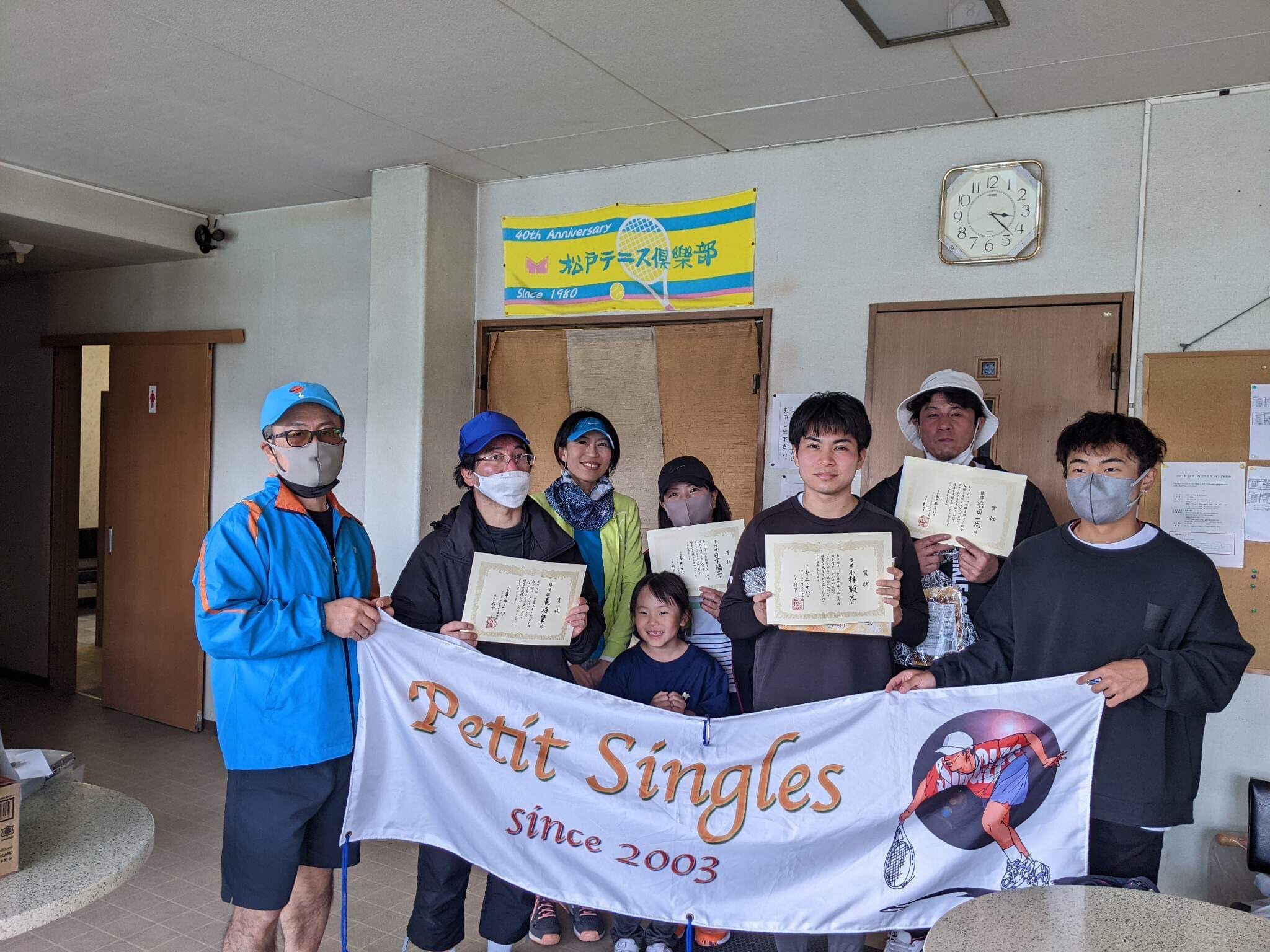 (いつも言っているのですが、初級者の皆さん、そんなこと気にせずに、どんどん来てください!負けても必ず5試合できるので、得るものがたくさんあるのがプチシングルス大会なので!)