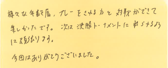 この日は、特にシングルスの中級者がたくさん集まり・・・いや、もう上級者でしょ!っていう人も多数いらっしゃり、なかなかレベルの高い大会となりました!