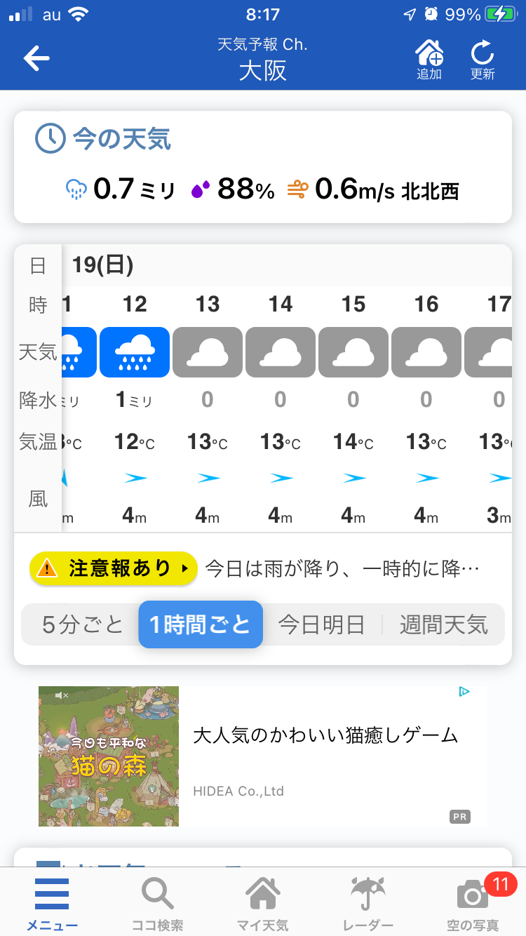 前の日の夕方から降り始めた雨がなかなか止まず、1時間予報でもこんな感じ。