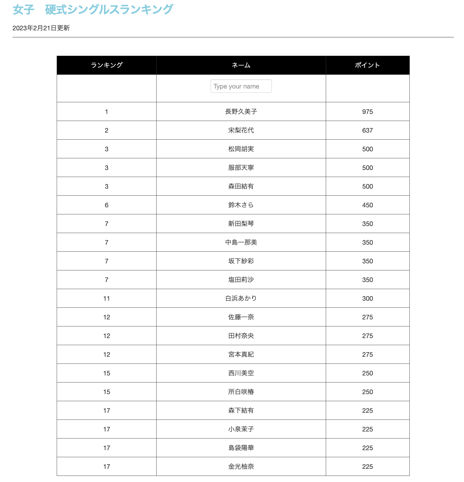 JFTPポイントランキング・2023年2月の女子シングルストップ20は誰?