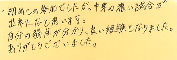初めて参加された方が、大会を通して何を感じたのか?特に初めて参加しようとしている方の参考にしていただけたらと思います。