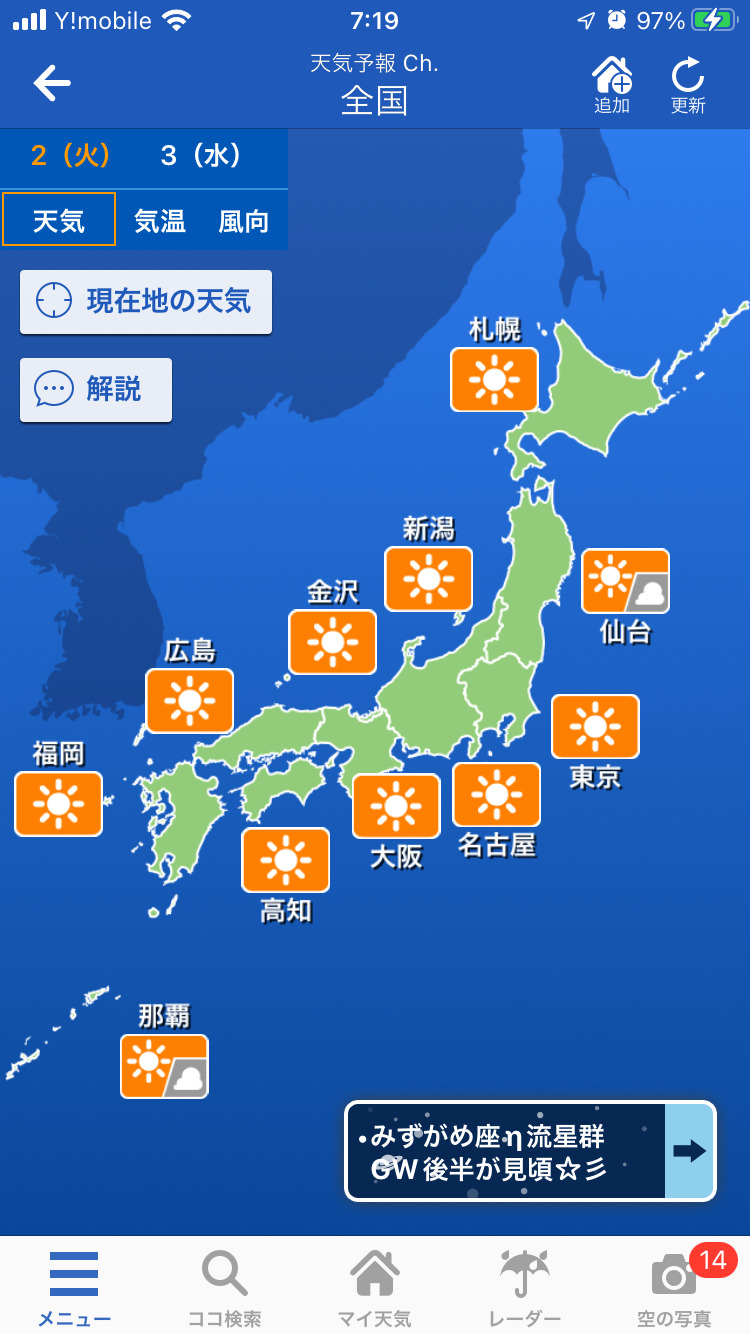 全国的にこんなに晴れマークが並んでるの、珍しいですよね!?