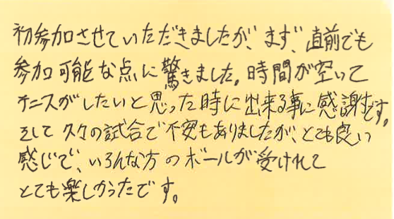 この日は、まだテニスを始めて数ヶ月という方も参加されていたのですが、とても楽しんでくださっておりました!