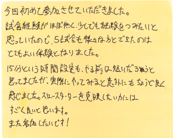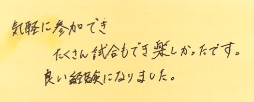初めて参加された方が、大会を通して何を感じたのか?特に初めて参加しようとしている方の参考にしていただけたらと思います。