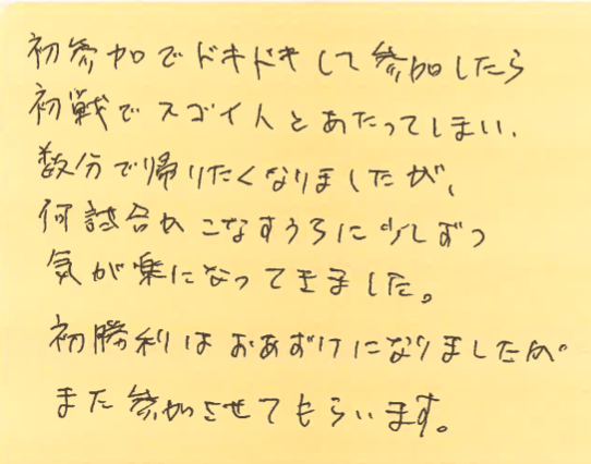 初参加の方も多く、初めての方との対戦もたくさんあり、プレーヤーとしてもドキドキしながらの大会となりました!