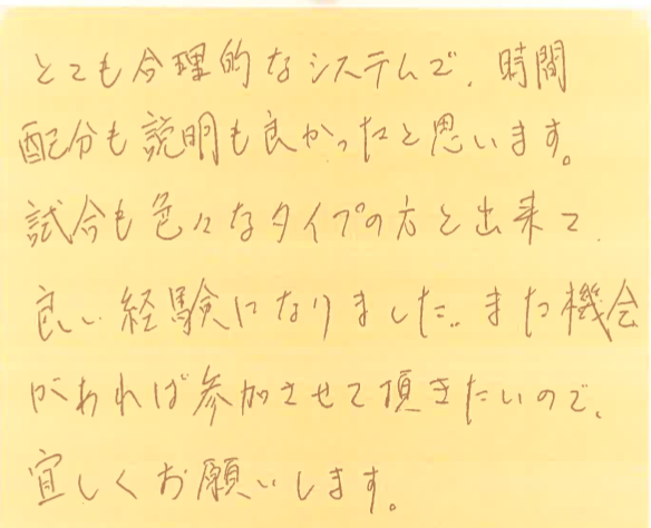 さて、今回は、12月29日に開催した松戸大会の写真と優勝された方のお名前、それと、この日に初めて参加してくださった方よりいただいた感想をご紹介させていただきます!
