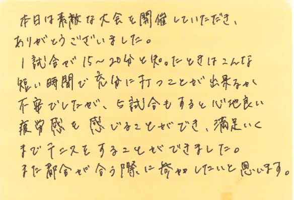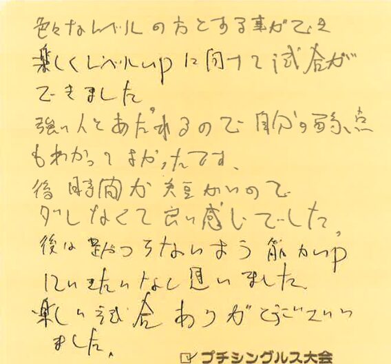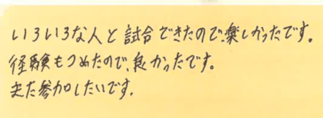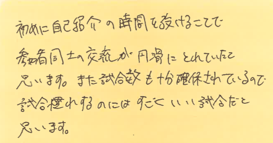 常連さん主体でしたが、皆さん、それぞれプレースタイルが違うので、とても楽しく試合経験を積むことができました!