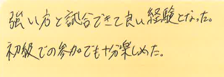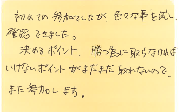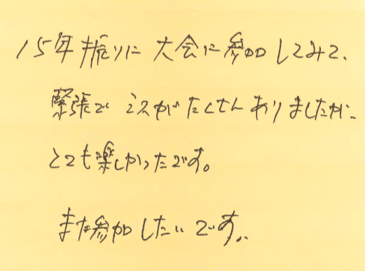 初めて参加された方が、大会を通して何を感じたのか?特に初めて参加しようとしている方の参考にしていただけたらと思います。