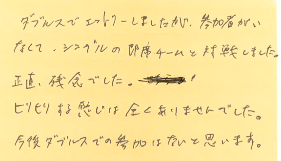 スタッフからの報告によりますと、「超強力なフォアを持つ松田選手と安定して各種ショットを繰り出す濱本選手との決勝でしたが、濱本選手が着実にポイントを重ね優勝しました。」とのことでした!!