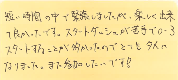 初めて参加された方が、大会を通して何を感じたのか?特に初めて参加しようとしている方の参考にしていただけたらと思います。