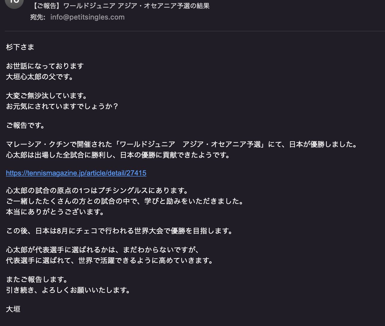 そこからは、どんどん差が開き、最初に紹介した動画のようなことになって・・・先日、あれから1年ちょっとが過ぎて、今では中学生になった大垣選手のお父様より突然、メールが届きました。