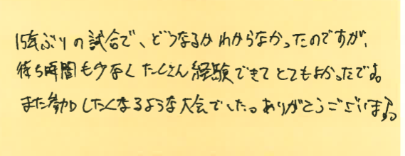 初めて参加された方が、大会を通して何を感じたのか?特に初めて参加しようとしている方の参考にしていただけたらと思います。