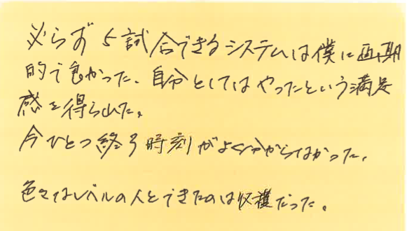 さて、今回は、7月20日から21日に開催した大会の写真と優勝された方のお名前、それと、その日に初めて参加してくださった方よりいただいた感想をご紹介させていただきます!