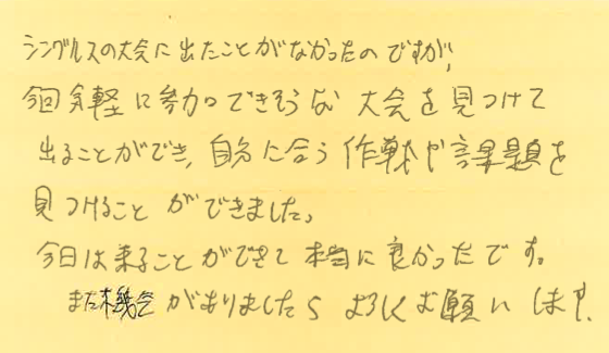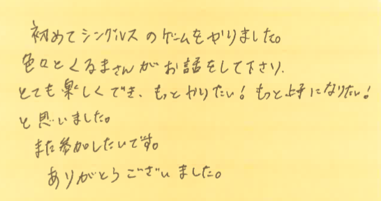 6月29日、7月13、27日の横浜プチシングルス大会に初めて参加してくださった方の感想です!