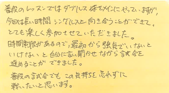 今回は、6月29日、7月13、27日の横浜プチシングルス大会に初めて参加された方の感想をシェアさせていただきます!