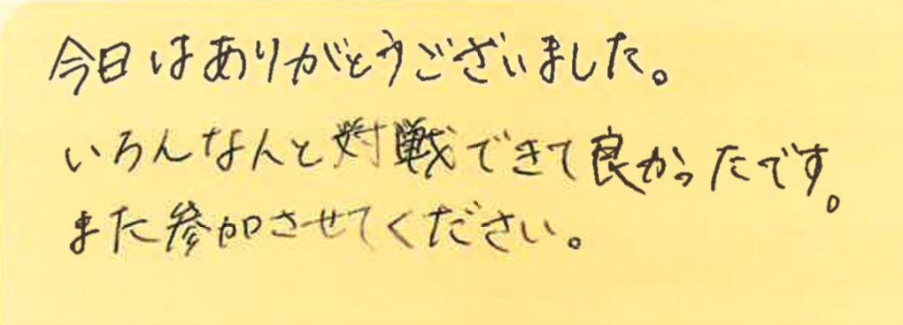 さて、今回は、10月16日から20日に開催した大会の写真と優勝された方のお名前、それと、その日に初めて参加してくださった方よりいただいた感想をご紹介させていただきます!