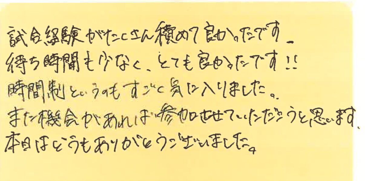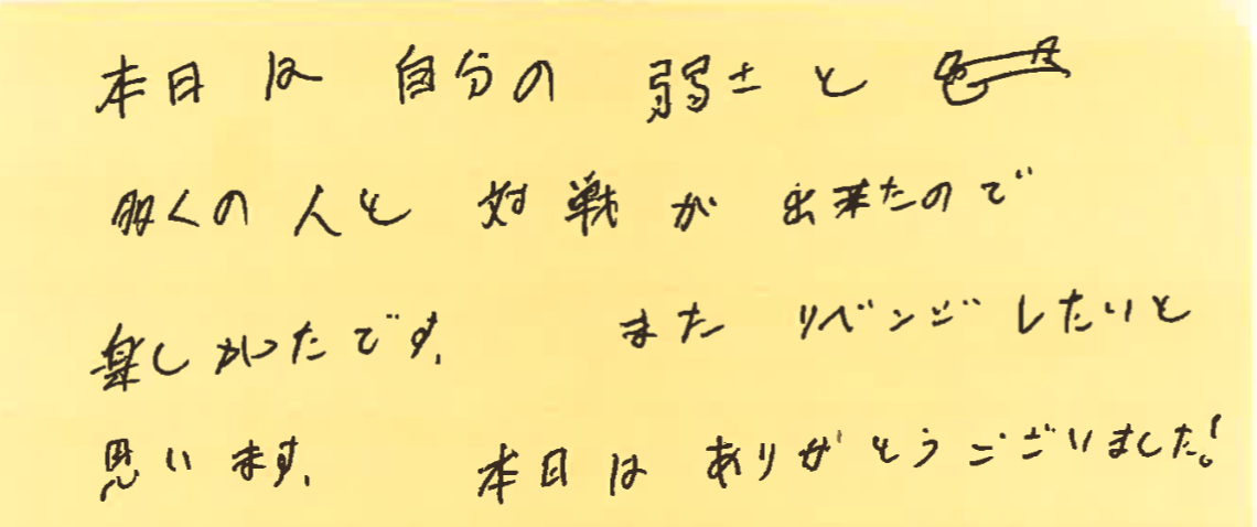 さて、今回は、10月26日から30日に開催した大会の写真と優勝された方のお名前、それと、その日に初めて参加してくださった方よりいただいた感想をご紹介させていただきます!