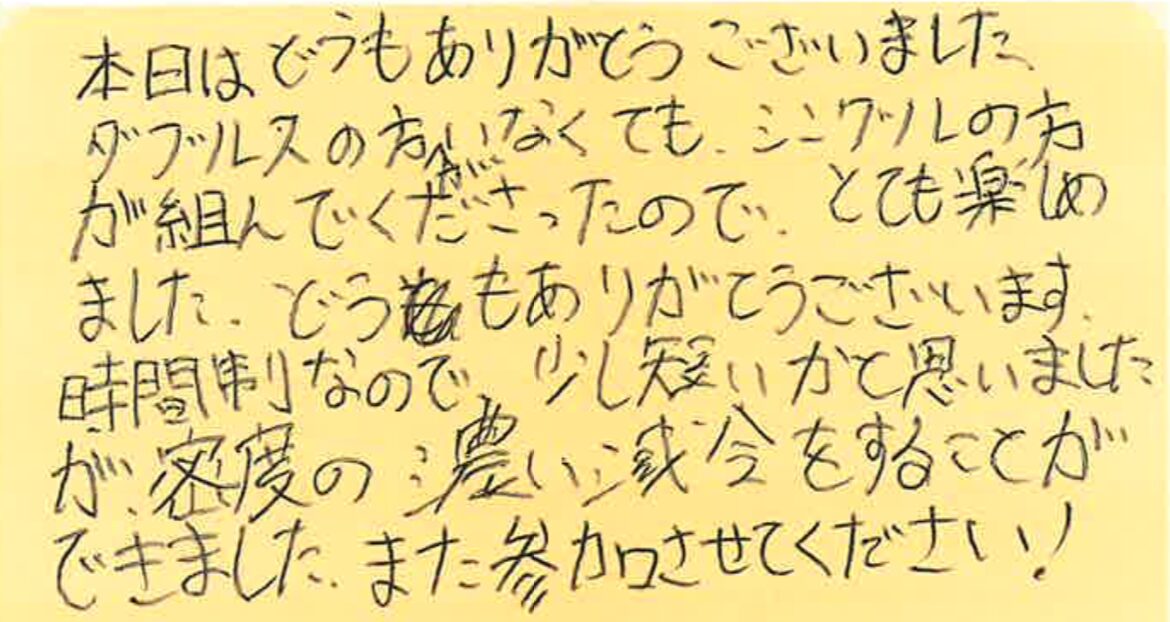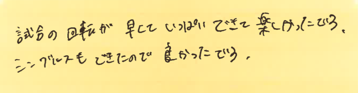この日は、珍しくシングルスもダブルスも非常にエントリーが少なかったので、シングルスの方にはダブルスも、ダブルスの方にはシングルスもやって頂きながら、お楽しみいただきました!