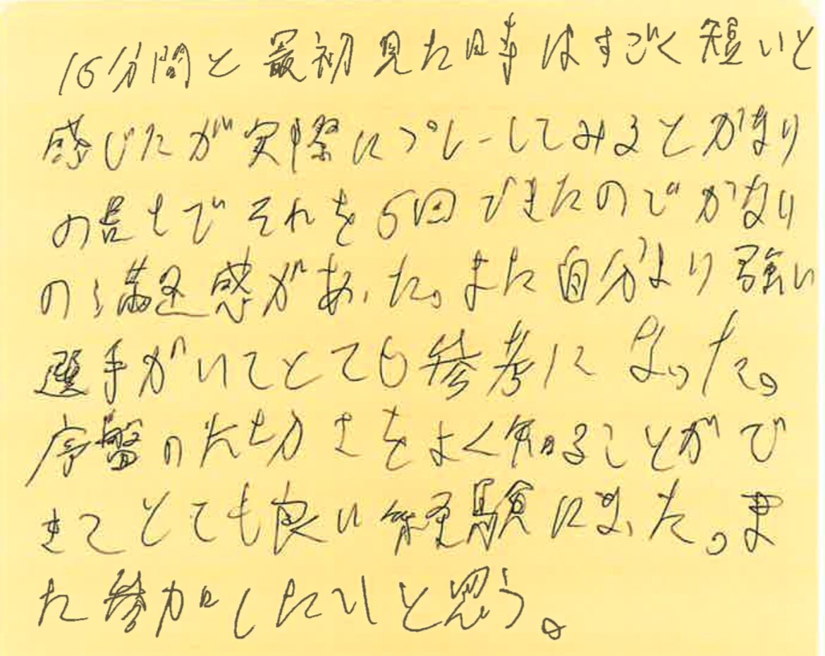 初めて参加された方が、大会を通して何を感じたのか?特に初めて参加しようとしている方の参考にしていただけたらと思います。