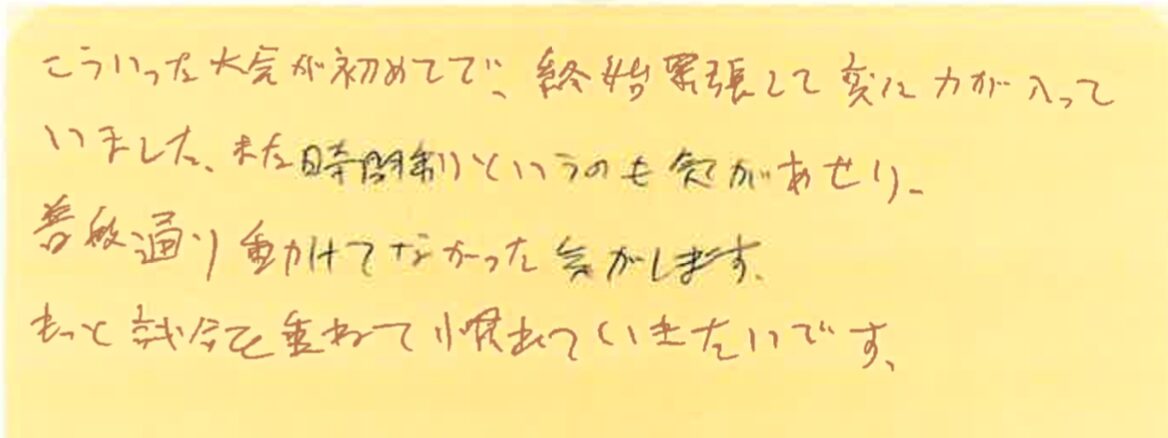初めて参加された方が、大会を通して何を感じたのか?特に初めて参加しようとしている方の参考にしていただけたらと思います。