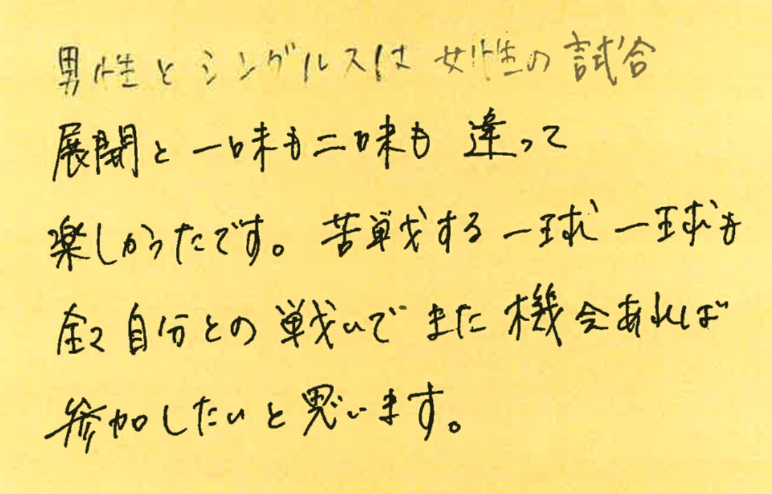 今回は、9月8、15、22、29日の調布プチシングルス大会に初めて参加された方の感想をシェアさせていただきます!
