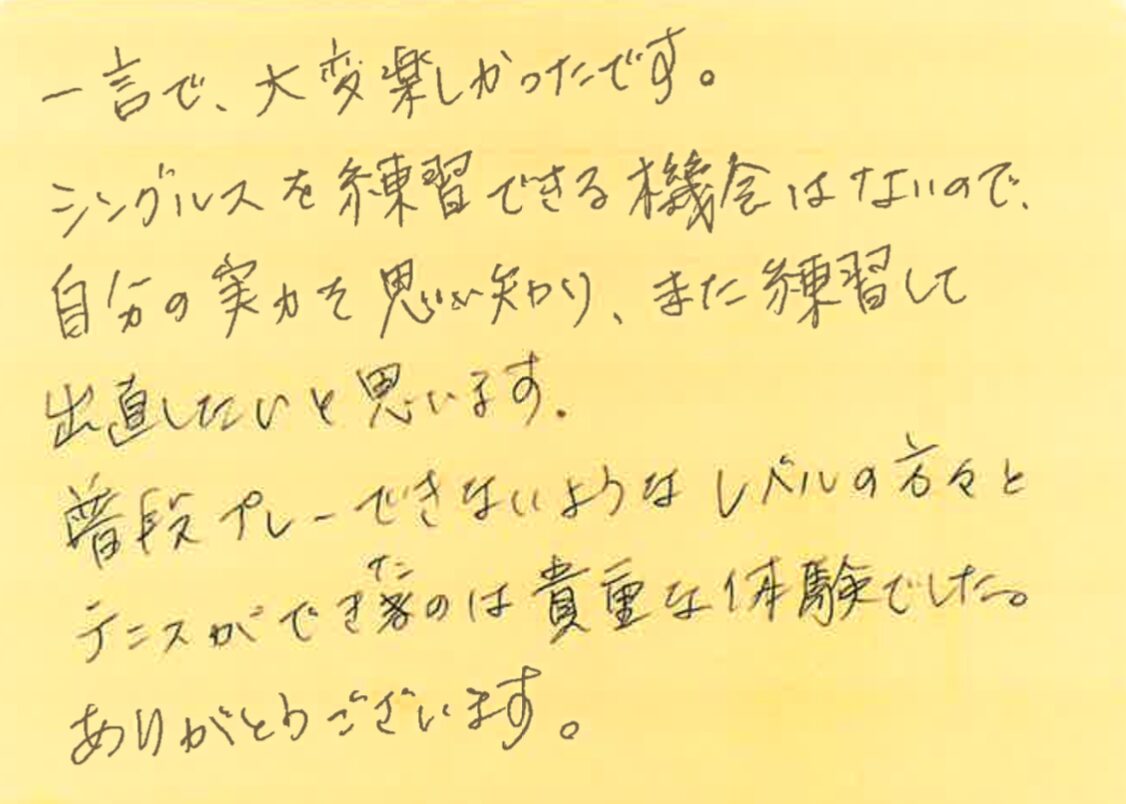今回は、10月6、13、20日の調布プチシングルス大会に初めて参加された方の感想をシェアさせていただきます!
