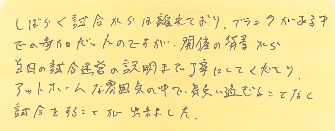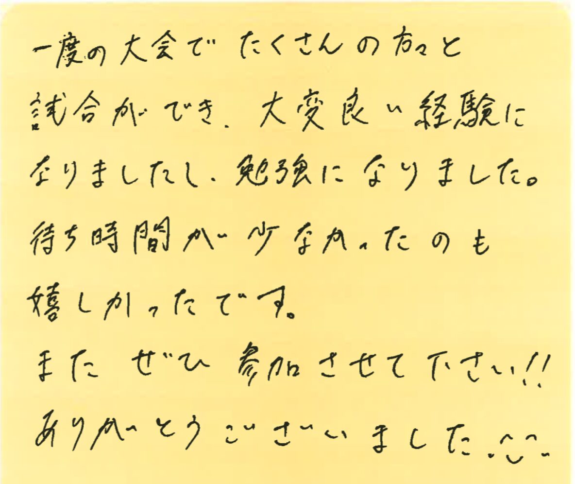 初めて参加された方が、大会を通して何を感じたのか?特に初めて参加しようとしている方の参考にしていただけたらと思います。