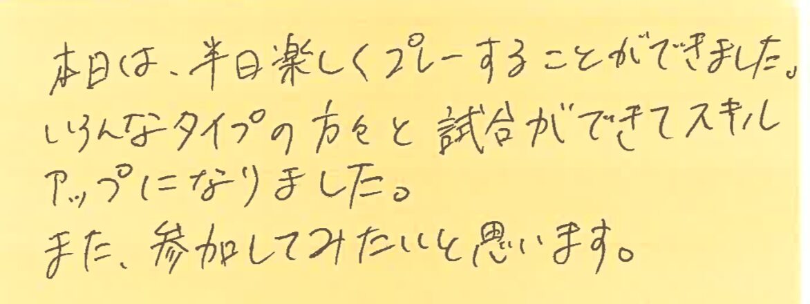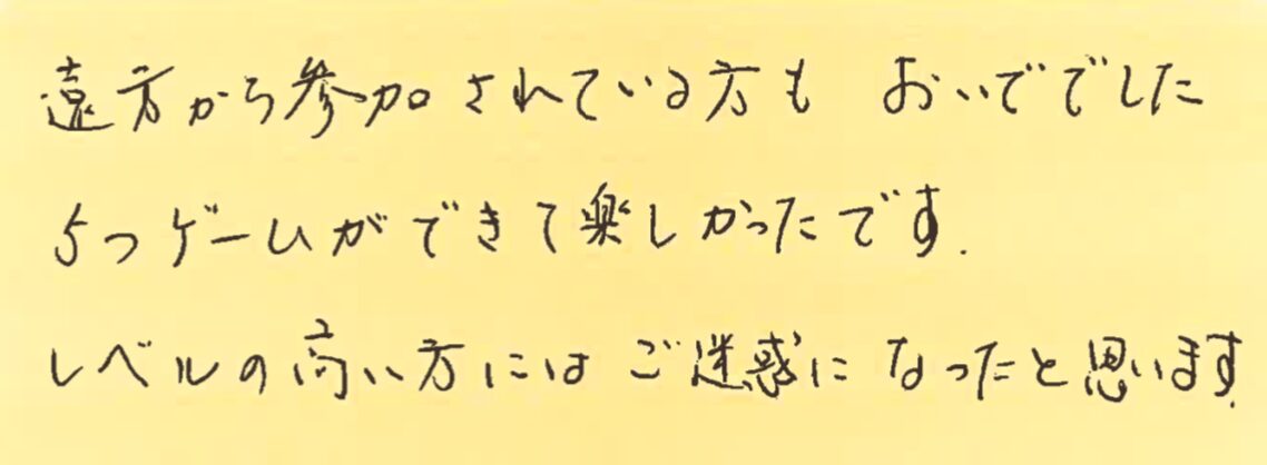 さて、今回は、11月6日から10日にかけて開催した大会の写真と優勝された方のお名前、それと、その日に初めて参加してくださった方よりいただいた感想をご紹介させていただきます!