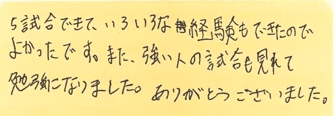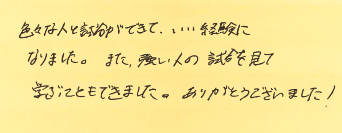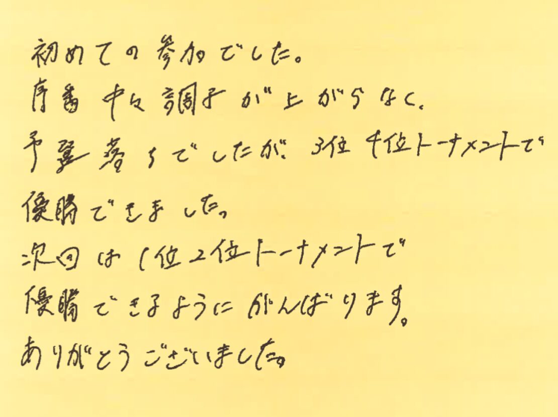 さて、今回は、1月11日から13日にかけて開催した大会の写真と優勝された方のお名前、それと、その日に初めて参加してくださった方よりいただいた感想をご紹介させていただきます!