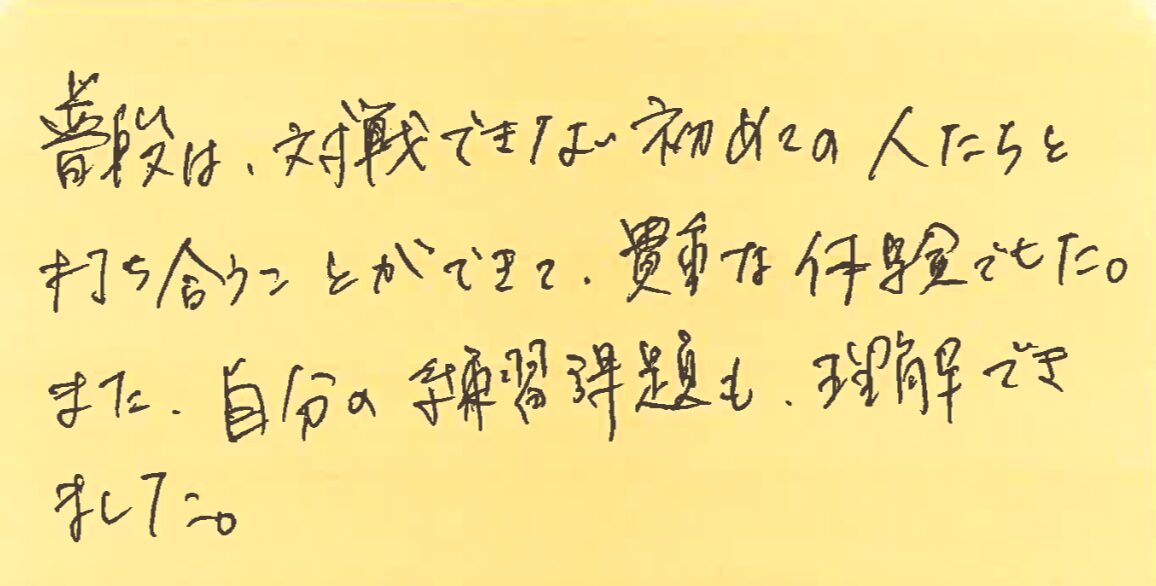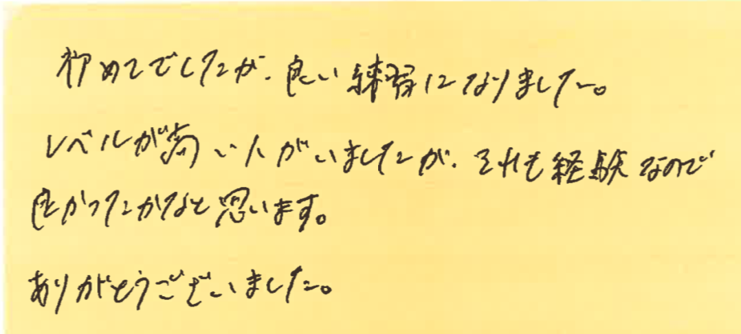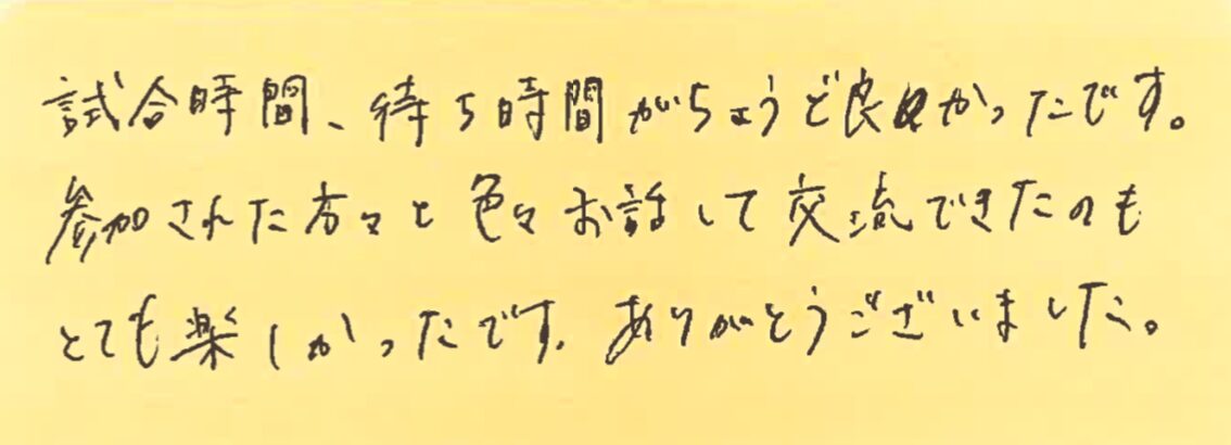 さて、今回は、1月29日から2月2日にかけて開催した大会の写真と優勝された方のお名前、それと、その日に初めて参加してくださった方よりいただいた感想をご紹介させていただきます!