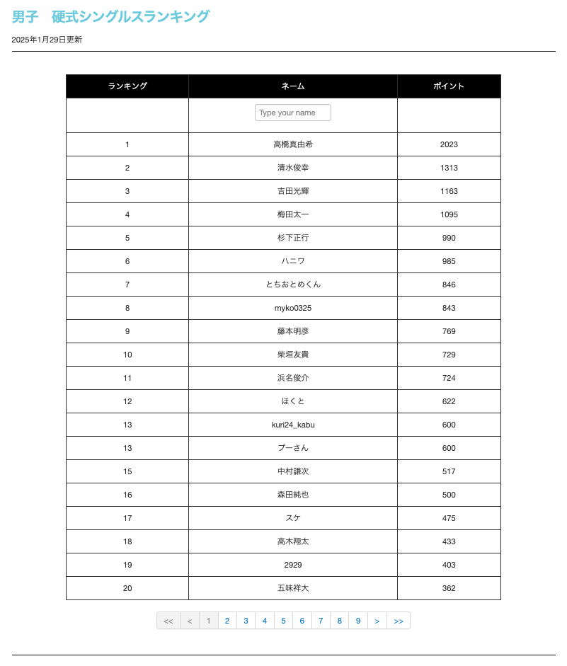 まずは男子シングルスのランキングより。