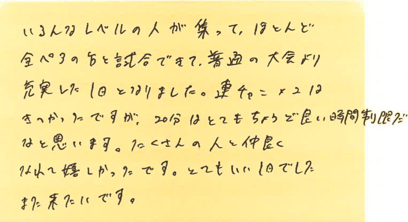 さて、今回は6月15日に開催した大会の写真と優勝された方のお名前、それと、その日に初めて参加してくださった方よりいただいた感想をご紹介させていただきます!