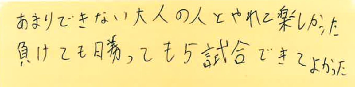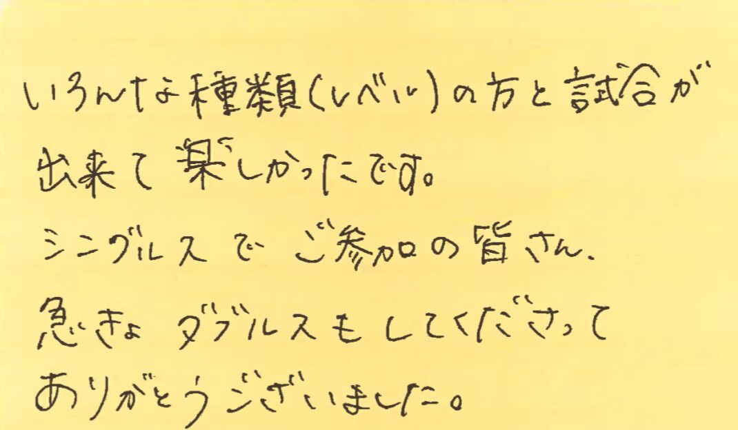 この日は、ダブルスが1ペアのみの参加でしたので、シングルスの皆さんで即席ペアを組ませていただき、しっかり5試合、お楽しみいただきました!