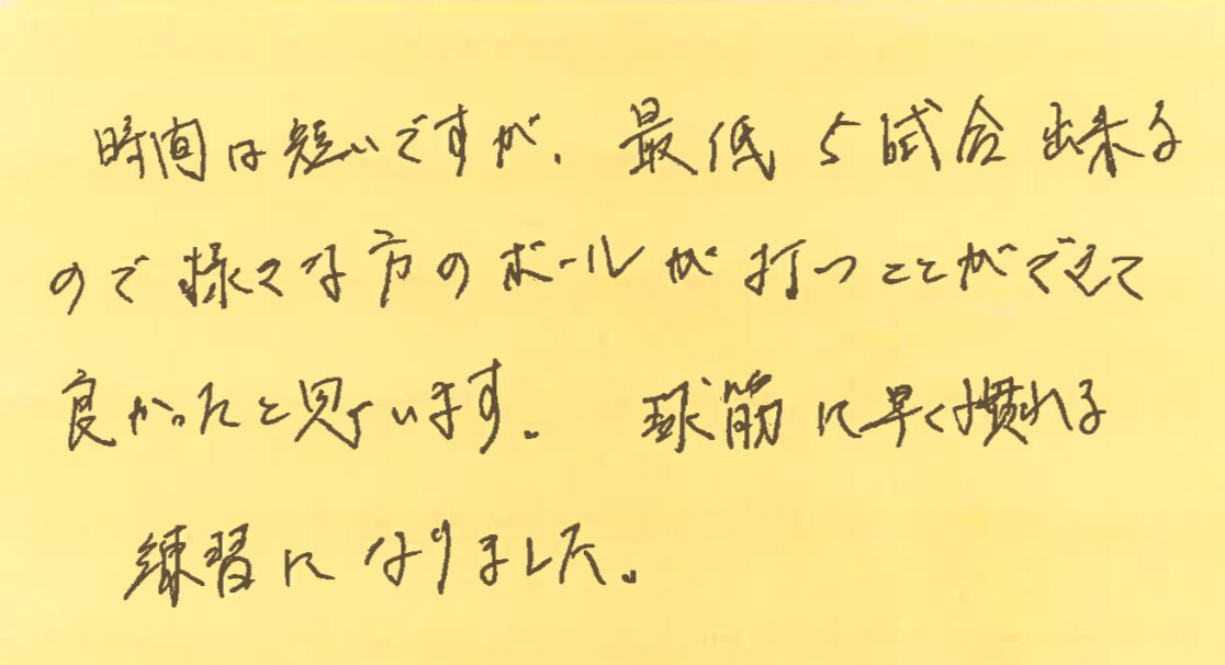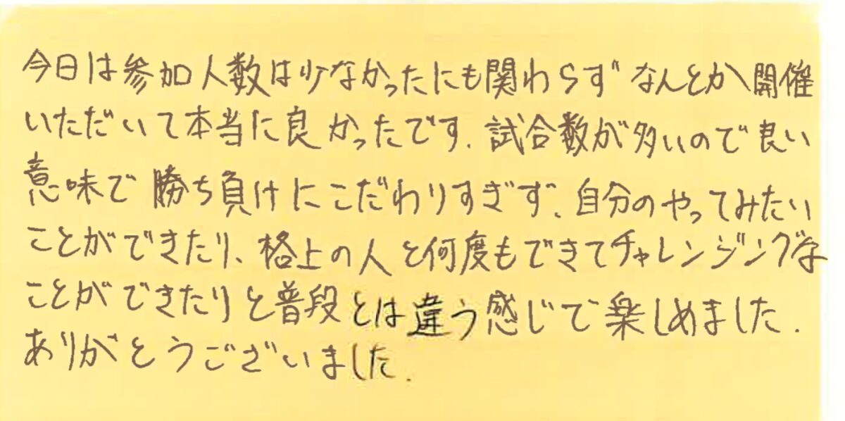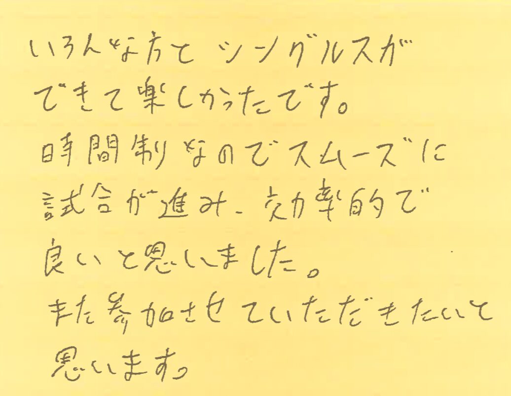 それと、「時間制なのでスムーズに試合が進み、効率的で良いと思いました」とのこと、そうなんですよ!