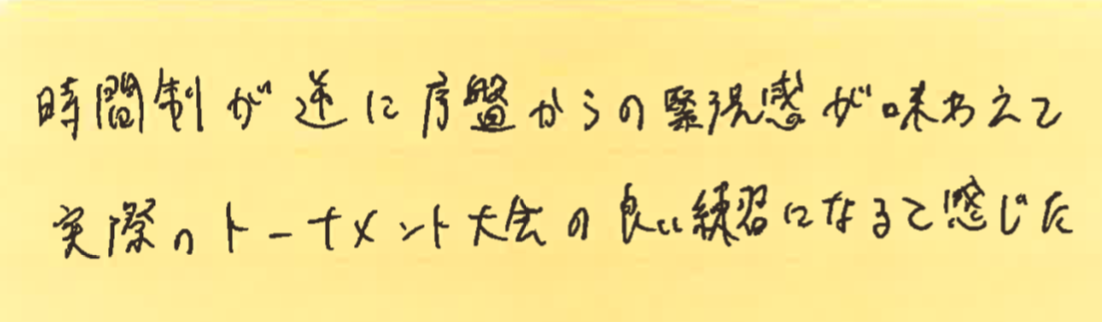 自分自身、たくさんの気づきと改善点を得られたので、次回の対戦に向けて、色々と努力して参ります!