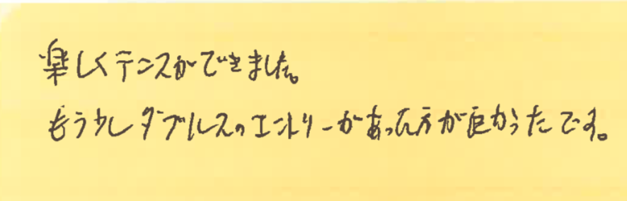 なので、プチダブルス大会では、どんな試合内容であっても、なるべく公平にコートの上で試合経験を積んでいただきたいと思って、時間制を採用しておりますので、その点、ご理解・ご納得の上、再度ご参加いただけたら嬉しいです。