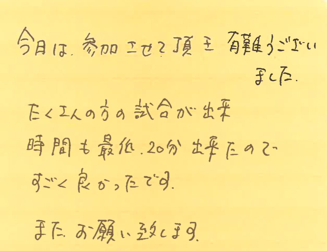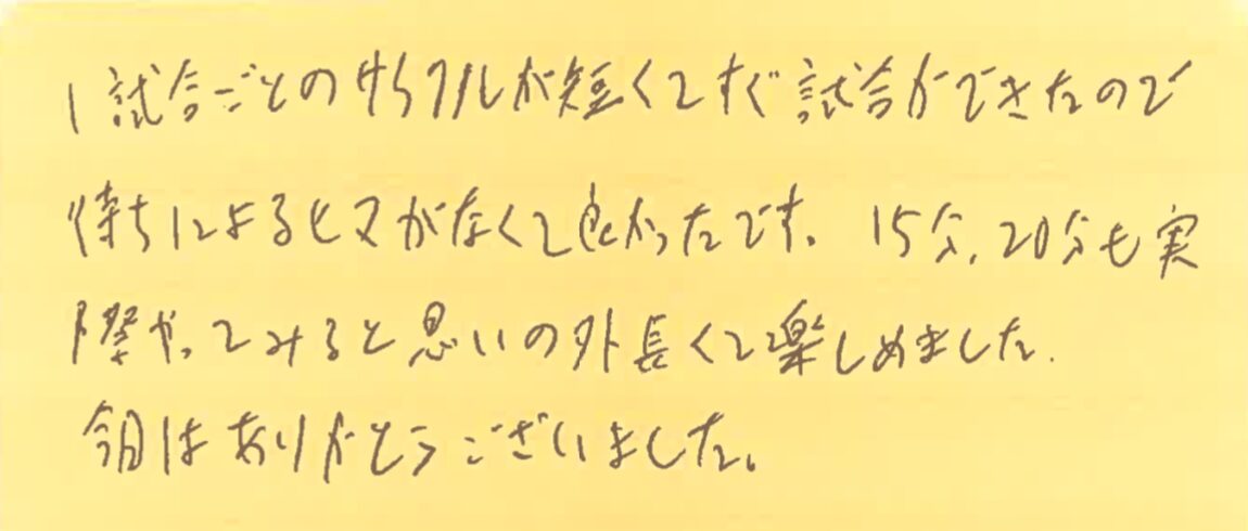 「1試合ごとのサイクルが短くてすぐ試合ができたので待ちになるヒマがなくて良かったです」とのこと、お楽しみくださり、よかったです!