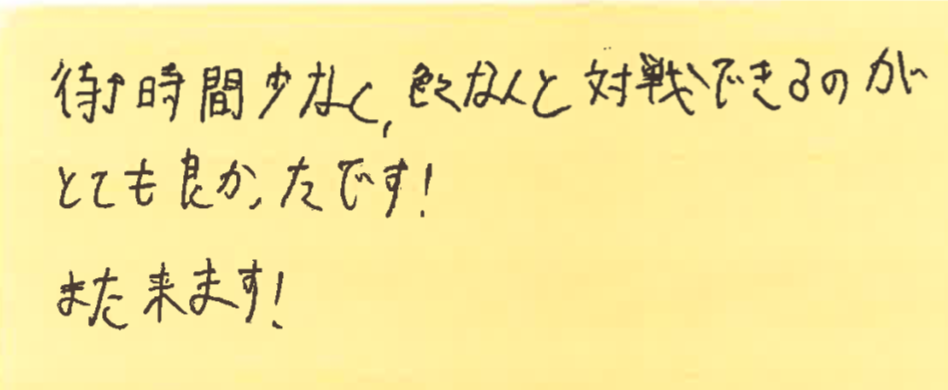 さて、今回は、少し遅くなってしまいましたが、1月7日から12日に開催した大会の写真と優勝された方のお名前、それと、その日に初めて参加してくださった方よりいただいた感想をご紹介させていただきます!