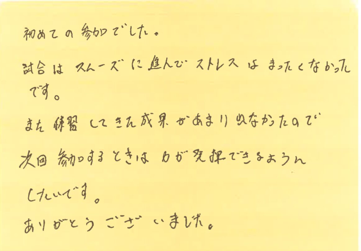 さて、今回は、1月21日から25日に開催した大会の写真と優勝された方のお名前、それと、その日に初めて参加してくださった方よりいただいた感想をご紹介させていただきます!