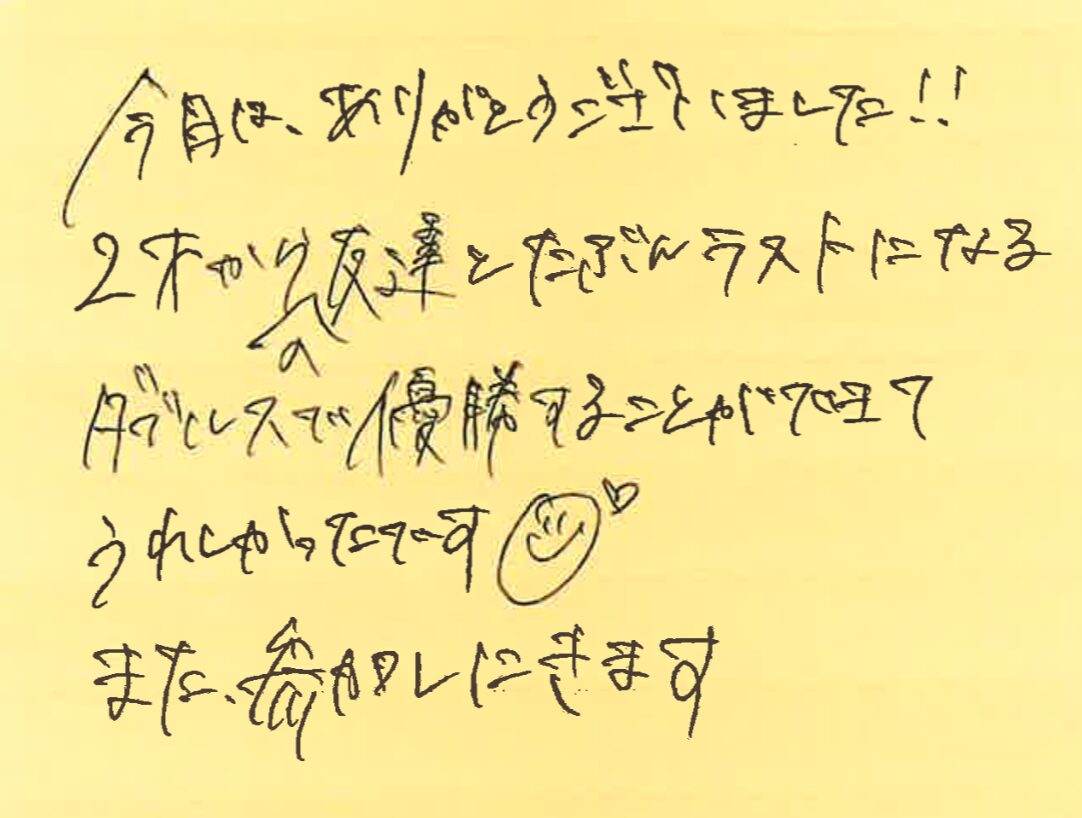 さて、今回は、3月4日から8日にかけて開催した大会の写真と優勝された方のお名前、それと、その日に初めて参加してくださった方よりいただいた感想をご紹介させていただきます!