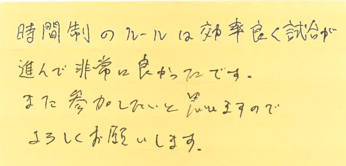 さて、今回は、3月20日から22日にかけて開催した大会の写真と優勝された方のお名前、それと、その日に初めて参加してくださった方よりいただいた感想をご紹介させていただきます!