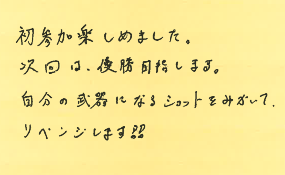 初めて参加された方が、大会を通して何を感じたのか?特に初めて参加しようとしている方の参考にしていただけたらと思います。