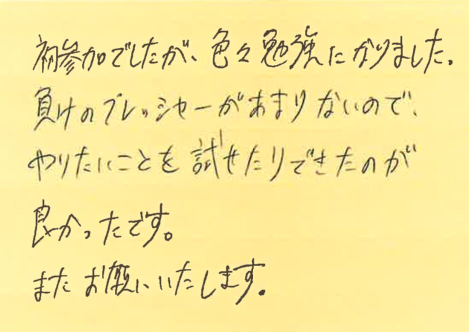 さて、今回は、4月16日から19日にかけて開催した大会の写真と優勝された方のお名前、それと、その日に初めて参加してくださった方よりいただいた感想をご紹介させていただきます!