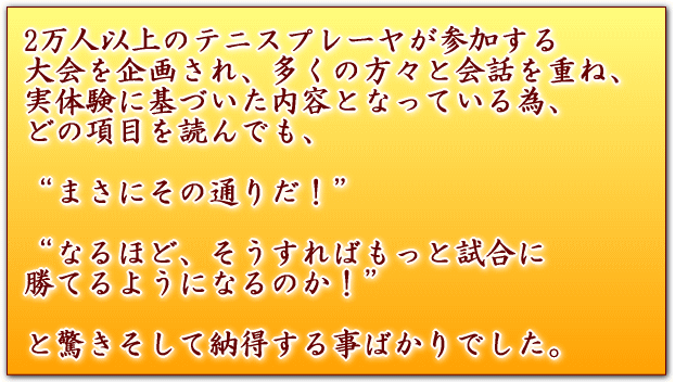 なお、それぞれのノウハウは、私が、今までの25年以上にわたってのテニス人生をベースに、数千試合の経験を通して、また、のべ2万人以上の方に大会に参加していただき、非常に多くの方と対戦したり、見たり、話をしたりして、検証を繰り返して、実感したものばかりです。