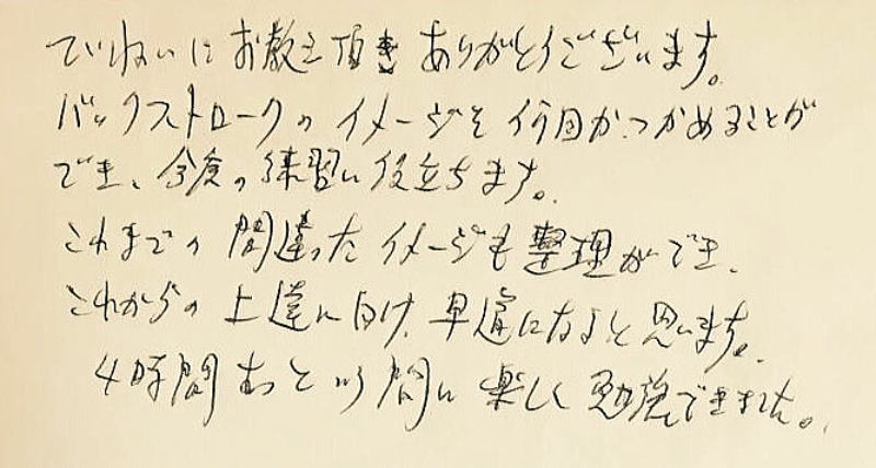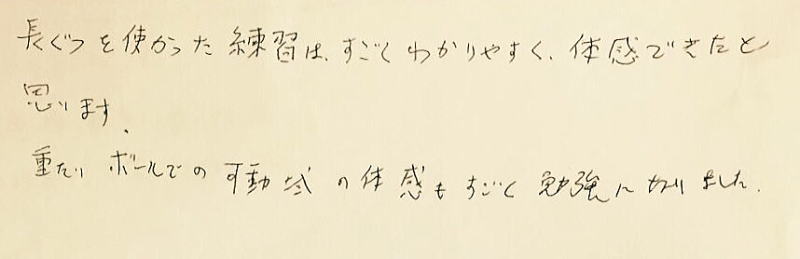 自然な振り抜きと、そうでない時を体感出来ましたので、感覚を忘れないようにしたいと思います。」