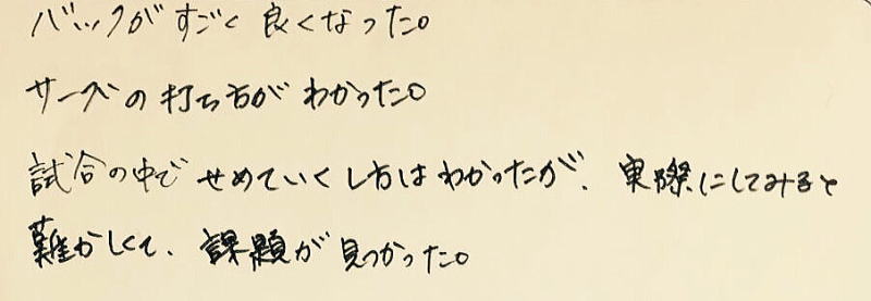 「フォアのストロークのスイングの仕方で今までは肘を体に近いところから打っていたけど、遠くからの方が振り抜きやすかった。」